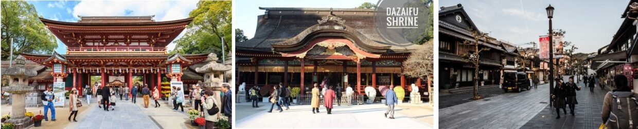 ศาลเจ้าดาไซฟู เท็นมังกุ (DaZaifu Tenmangu Shrine) ถือว่าเป็นศาลเจ้าที่มีชื่อเสียงติดหนึ่งในสองจากบรรดาศาลเจ้าเท็นมังกุนับพันๆแห่งในญี่ปุ่น อายุของศาลเจ้าแห่งนี้มีอายุนับพันปี ถูกสร้างขึ้นตั้งแต่ในยุคเฮอัน(Heian) เดิมทีเป็นการสร้างขึ้นเพื่อเป็นการสักการะให้แก่นักปราชญ์แห่งยุคนามว่า “สุกาวะระ มิชิซาเนะ(Sugawara Michizane)” ที่นี่จึงเหมือนจะมีชื่อเสียงในการขอพรด้านการเรียนการศึกษา ช่วงใกล้สอบนักเรียนนักศึกษาจะมาขอพรกันเยอะมากๆ ศาลเจ้ามีขนาดใหญ่ทำให้มีการแบ่งเป็นโซนๆชัดเจน โดยตลอดเส้นทางมาศาลและรอบๆจะมีร้านค้ามากมายตลอดสาย