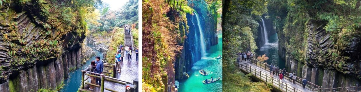 หลังอาหารเช้า นำท่านเดินทางสู่ หุบเขาทะคะจิโฮะ (Takachiho Gorge) ทางตอนเหนือในจังหวัดมิยาซากิ (Miyazaki) (เดินจากที่จอดรถ ขาละ 800เมตร) เป็นแหล่งท่องเที่ยวเสริมดวงชะตายอดนิยมในหมู่สาวๆ หน้าผาชันสูงเฉลี่ย 80 เมตร (บางช่วงสูงมากถึง 100 เมตร) ทอดตัวเป็นแนวยาวถึง 7 กิโลเมตรจนกลายเป็นหุบเขาที่งดงามประทับใจ เพียงแค่ได้เดินไปตามทางเดินชมวิวแล้วชื่นชมกับทัศนียภาพรอบๆ ก็จะรู้สึกราวกับได้รับการชำระล้างจิตใจให้ใสสะอาดจากการได้สัมผัสกับความยิ่งใหญ่อันทรงพลังของธรรมชาติ