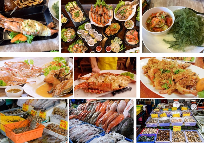 (อาหารทะเลสด เช่น กุ้งมังกร, ปลา, ปูม้าสด, กุ้ง, หอยชนิดต่างๆ, น้ำจิ้มรสเด็ด)