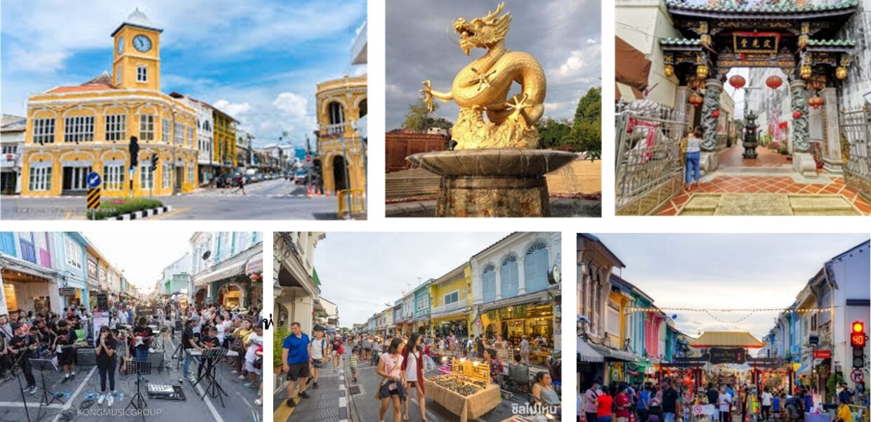 นำคณะเดินชมย่านเมืองเก่าภูเก็ต แหล่งการค้าที่สำคัญจากอดีตถึงปัจจุบัน ชมสภาพบ้านเรือนซึ่งสร้างในสมัยยุคเหมืองแร่เฟื่องฟูในอดีต สถาปัตยกรรมแบบชิโนยูโรเปี่ยน ชมตึกโบราณ ถ่ายรูป PHUKET STREET ART ที่สะท้อนวิถีชีวิตชาวภูเก็ต